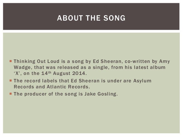 Berikut lirik lagu dan chord gitar Thinking Out Loud milik Ed Sheeran. About Thinking Out Loud Thinking Out Loud is a song by English singer-songwriter Ed Sheeran recorded for his second studio album 2014. SonoraID - Lagu Thinking Out Loud milik Ed Sheeran dirilis pada tahun 2014 lalu.